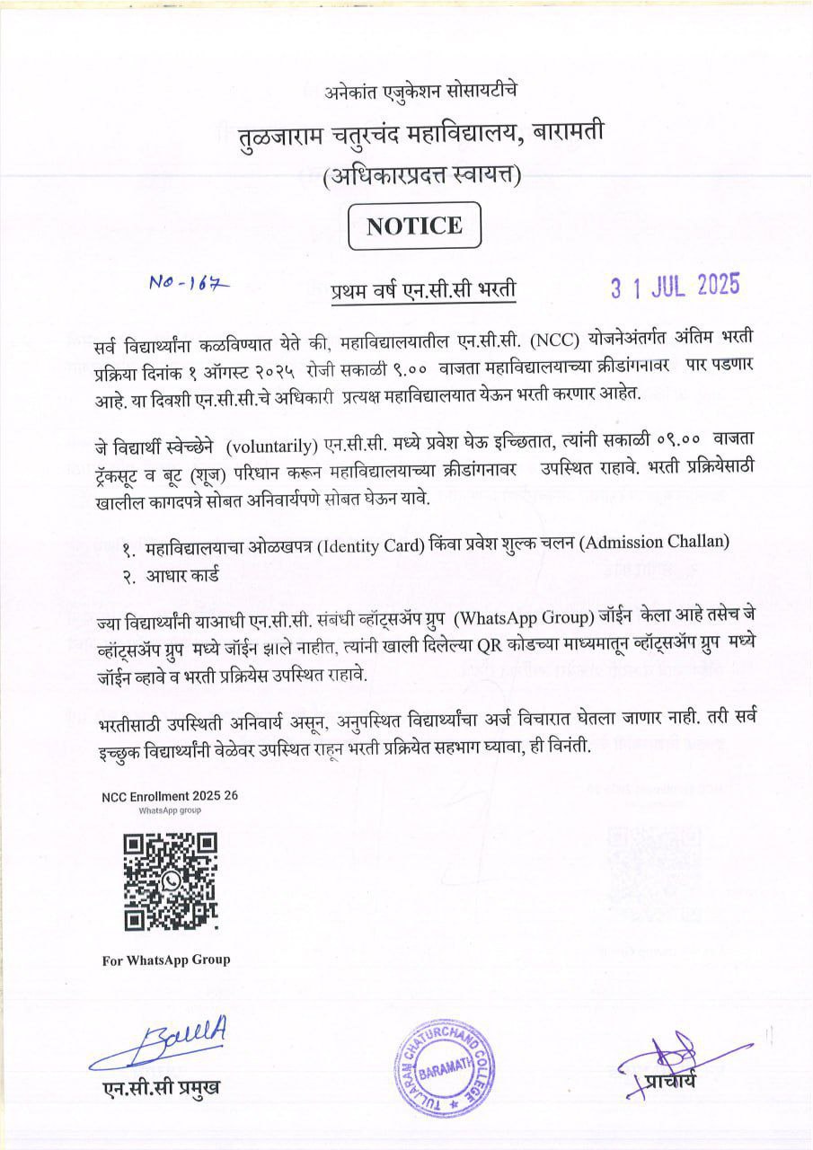 प्रथम वर्ष एन. सी. सी. (NCC) भरती नावनोंदणी